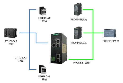 HT3S-PNS-ECS网关连接到PROFINET总线中作为从站使用,连接到EtherCAT总线中作为从站使用。